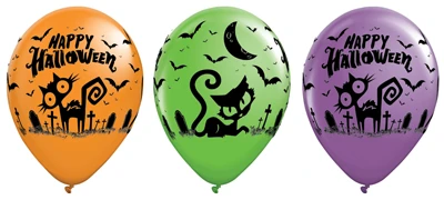 Enhance your Halloween ambiance with our spooky-themed balloons showcasing the creepiest cats and eerie bats against a graveyard backdrop. Printed on vibrant orange, lime green, and violet latex balloons, these decorations add a burst of color to your festivities. These balloons are perfect for setting the scene at your Halloween party or haunted house with their spooky charm.