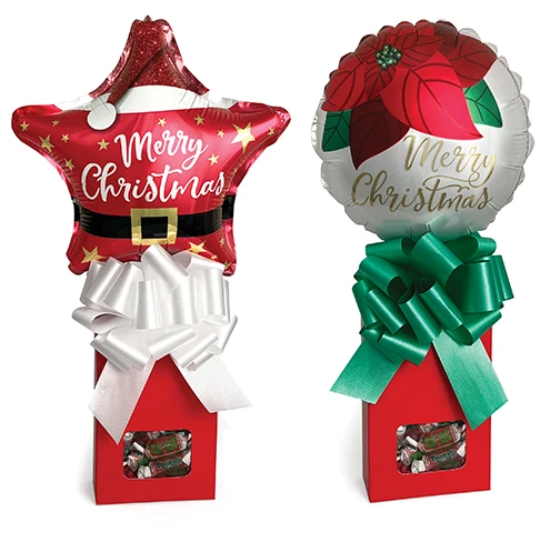 This bright red treat box is filled with chocolate kisses and topped with a colorful Christmas balloon and coordinating bow. Ready to sell - no assembly required. Because Ready Go Gifts are made to order, please allow an extra week for delivery.