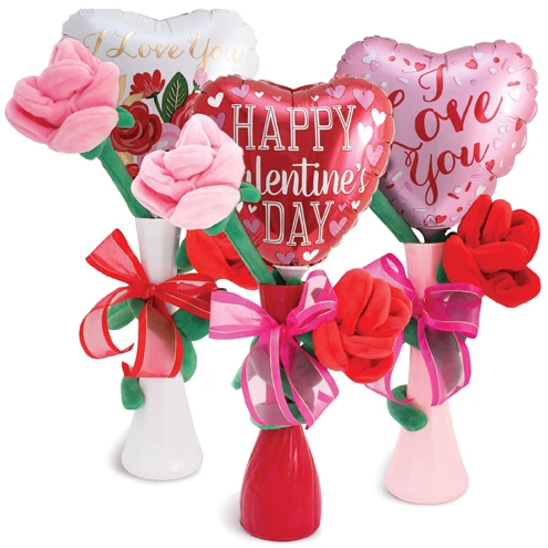 This preassembled Valentine's Day balloon gift is perfect for easy store merchandising. Each arrangement features an "I Love You" or "Happy Valentine's Day" balloon in a coordinating plastic vase, accented with two plush roses and a satin-edged bow. A thoughtful sugar-free gift option for loved ones.