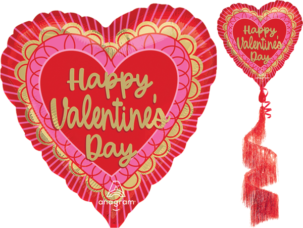 Celebrate love with our vibrant red heart-shaped balloon featuring "Happy Valentine's Day" in elegant gold script. Adorned with scalloped edges & shimmering pink & gold accents, this festive balloon adds charm to any romantic celebration.