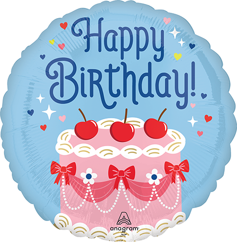 Celebrate in sweet style with this round foil balloon featuring a layered pink birthday cake topped with three cherries and decorative frosting details. Set against a light blue background, the design includes colorful hearts and sparkles surrounding a bold "Happy Birthday!" message for a cheerful and festive look. Ideal for birthday parties, cake table d‚cor, and celebratory displays.