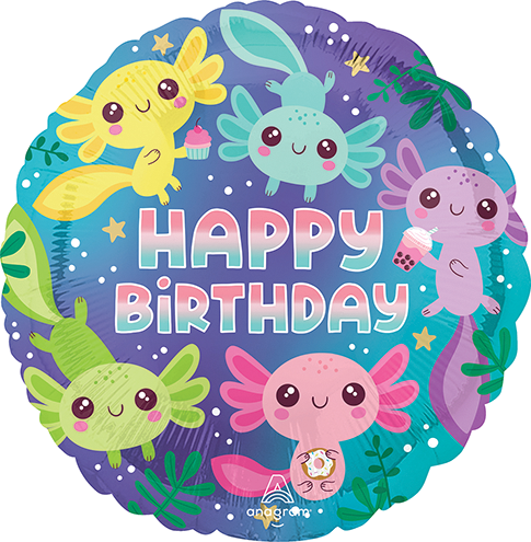 Celebrate with adorable underwater charm using this round foil balloon featuring multiple cute axolotl characters in pastel colors surrounding a bold "HAPPY BIRTHDAY" message. Each axolotl holds a fun treat such as cupcakes and drinks, set against a blue aquatic background with bubbles, plants, and star accents for a playful party look. Perfect for kids birthday celebrations, aquatic themes, and cheerful d‚cor displays.