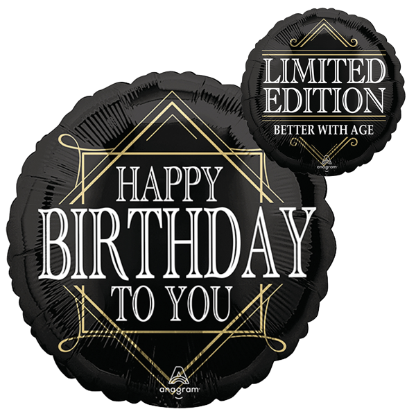 Celebrate in classy style with this round foil balloon featuring a bold "HAPPY BIRTHDAY TO YOU" message in white lettering on a black background. The design is framed with elegant gold geometric line accents and includes a coordinating "LIMITED EDITION BETTER WITH AGE" badge for a sophisticated celebratory look. Ideal for milestone birthdays, refined parties, and upscale d‚cor displays.