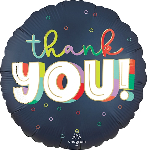 Show your gratitude in style with our colorful "thank YOU!" balloon! This round foil balloon features a dark blue background with playful multicolored text and scattered confetti dots. Perfect for employee recognition, teacher appreciation, or any heartfelt thank-you moment, it’s a cheerful way to say thanks.