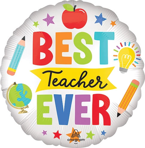 Celebrate your favorite educator with our "BEST Teacher EVER" foil balloon. Featuring bold, colorful lettering and cheerful school-themed illustrations like an apple, pencils, globe, and light bulb, this vibrant balloon is perfect for Teacher Appreciation Week or end-of-year gifts. Show your gratitude with this fun and festive classroom-ready decoration.