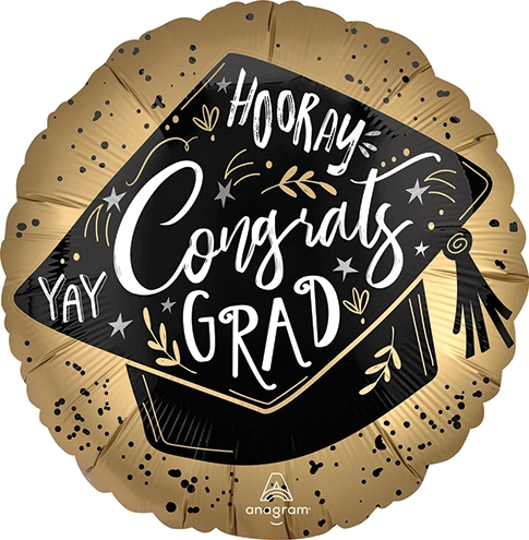 Celebrate your graduate with this stylish balloon featuring a grad cap design on a shimmering gold background. The cap is adorned with the words "Hooray," "Yay," and "Congrats Grad," making it a festive and elegant addition to any graduation party or gift!