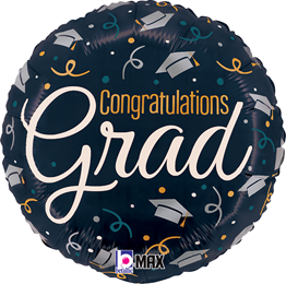 Celebrate your graduate with this elegant "Congratulations Grad" balloon featuring a dark background, gold and white confetti, graduation caps, and stars. Perfect for graduation parties, gifts, and photo backdrops.