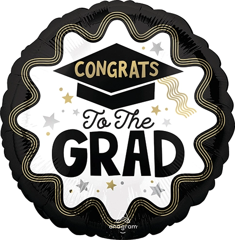 Celebrate graduation with our round foil balloon featuring a bold black cap and the message "CONGRATS To The GRAD". With a black, white, and gold color scheme, scalloped border, and festive stars and accents, this elegant design is perfect for honoring academic achievement.