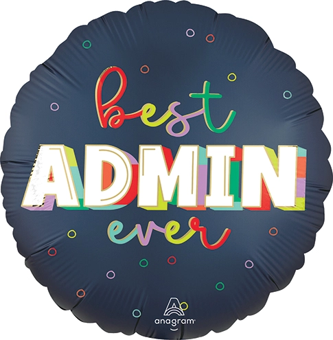 Celebrate your team with our "best ADMIN ever" balloon! This round balloon features a dark blue background with vibrant, multicolored text and playful patterns. With bold lettering and cheerful design elements like scattered dots, it’s the perfect way to show appreciation during Admin Professionals Week or any office celebration.