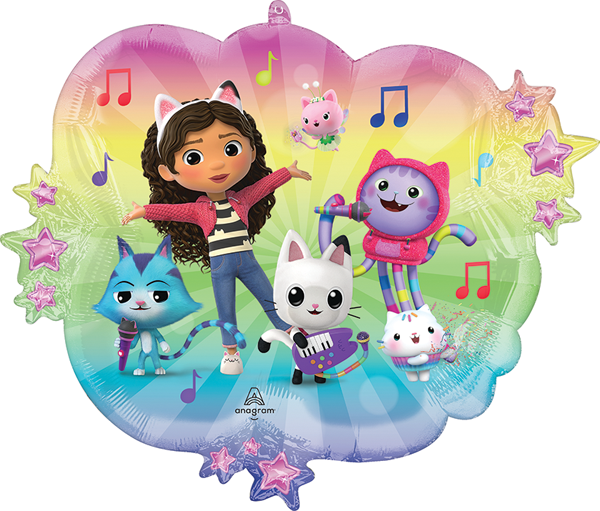 Celebrate with the colorful "Gabby's Dollhouse" balloon featuring Pandy Paws, Cakey Cat, DJ Catnip & Baby Box! This vibrant party balloon showcases a rainbow background, musical notes & stars-perfect for themed birthdays & kids' celebrations.