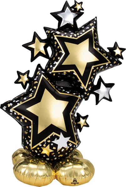 Add a touch of sophistication and sparkle to any celebration with this Black and Gold Elegant Star Cluster air-fill AirLoonz balloon! Featuring a stunning mix of black and gold stars in a dazzling cluster, this balloon brings a refined, festive flair to your event. Perfect for milestone celebrations, New Year's Eve, or any special occasion, its bold colors and elegant design will make a statement and fill the room with joy and excitement. A truly striking decoration that's sure to shine!