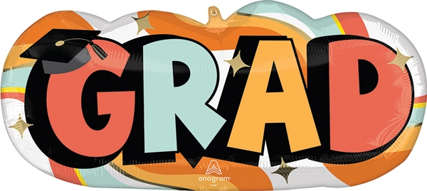 Make graduation unforgettable with our elongated foil balloon featuring bold, multicolor letters spelling "GRAD". With a black graduation cap atop the "G" and vibrant swirls and stars in the background, this eye-catching balloon adds festive flair to any celebration.