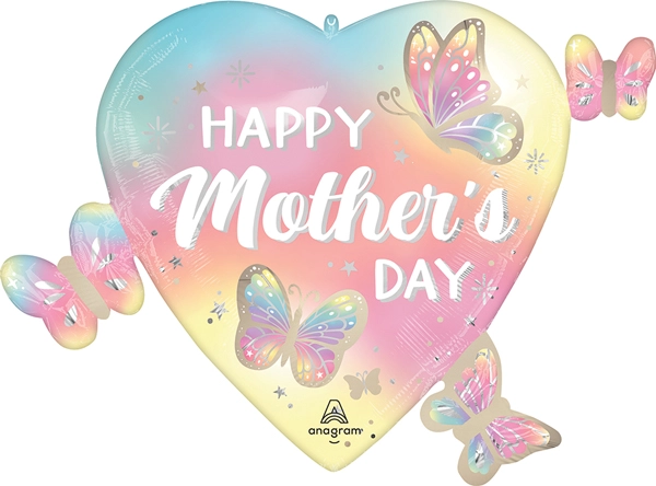 This heart-shaped balloon features a pastel gradient background in pink, yellow, and blue, adorned with butterflies, stars, and sparkles. The message "HAPPY Mother's DAY" is displayed in white with a mix of bold and cursive fonts. A whimsical and colorful way to celebrate Mom.