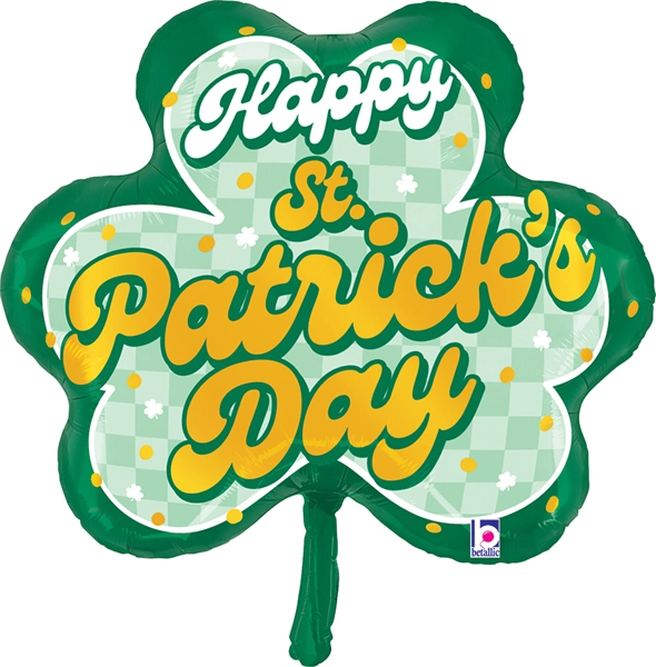 Celebrate Irish spirit with our shamrock-shaped balloon featuring a light green checkered background & scattered yellow dots. The festive "Happy St. Patrick's Day" message in white & yellow adds charm to your holiday decor.